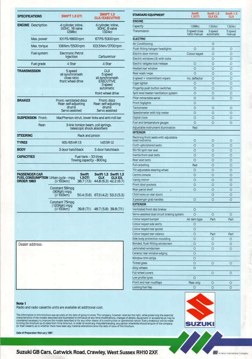 MK1 Introduced March 1984, the SA Swift was front wheel drive, with a solid axle and drum brakes on the rear, with front disc brakes. Models: GA, GL, GC and GLS.